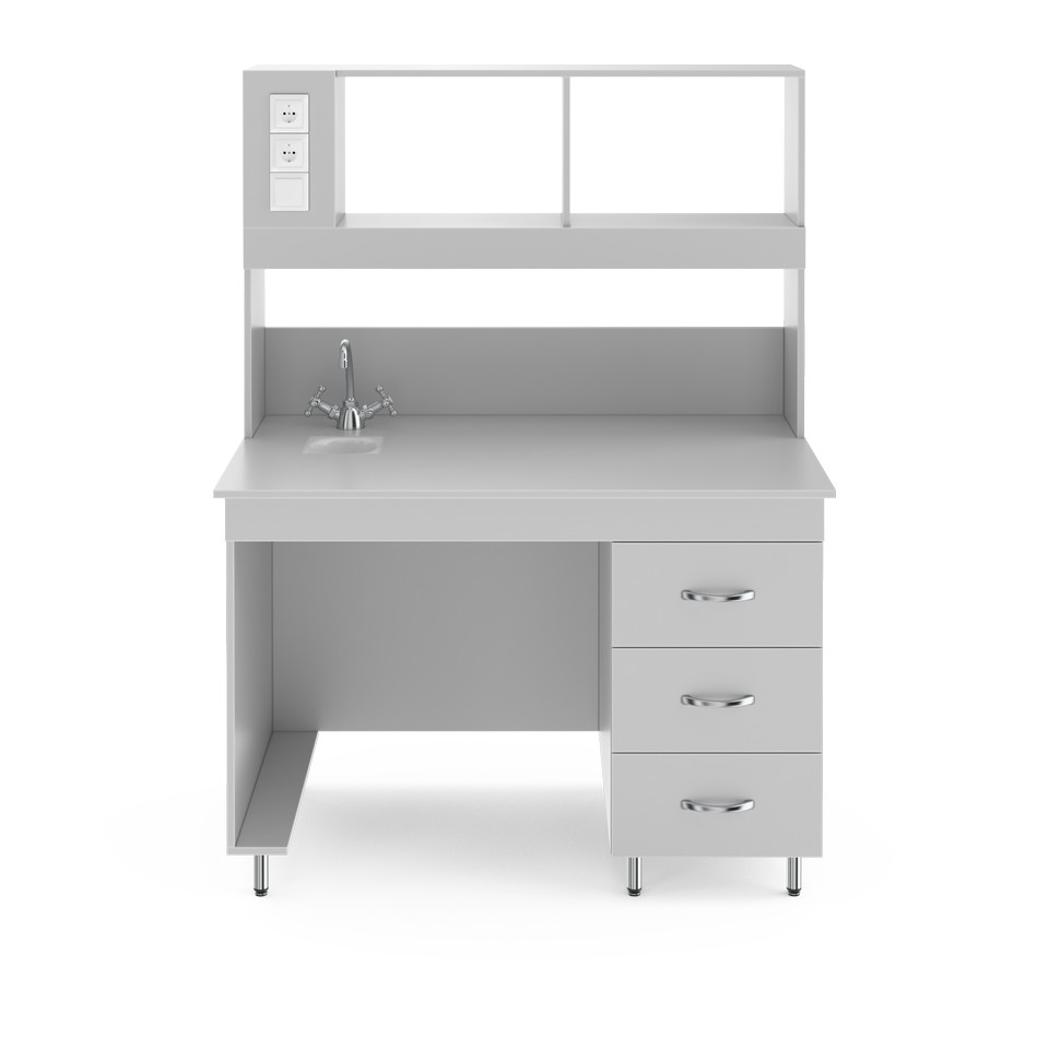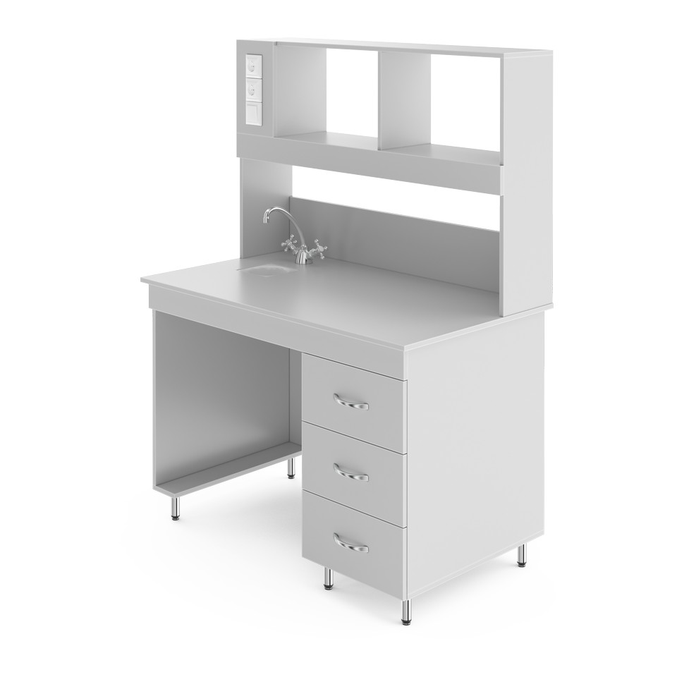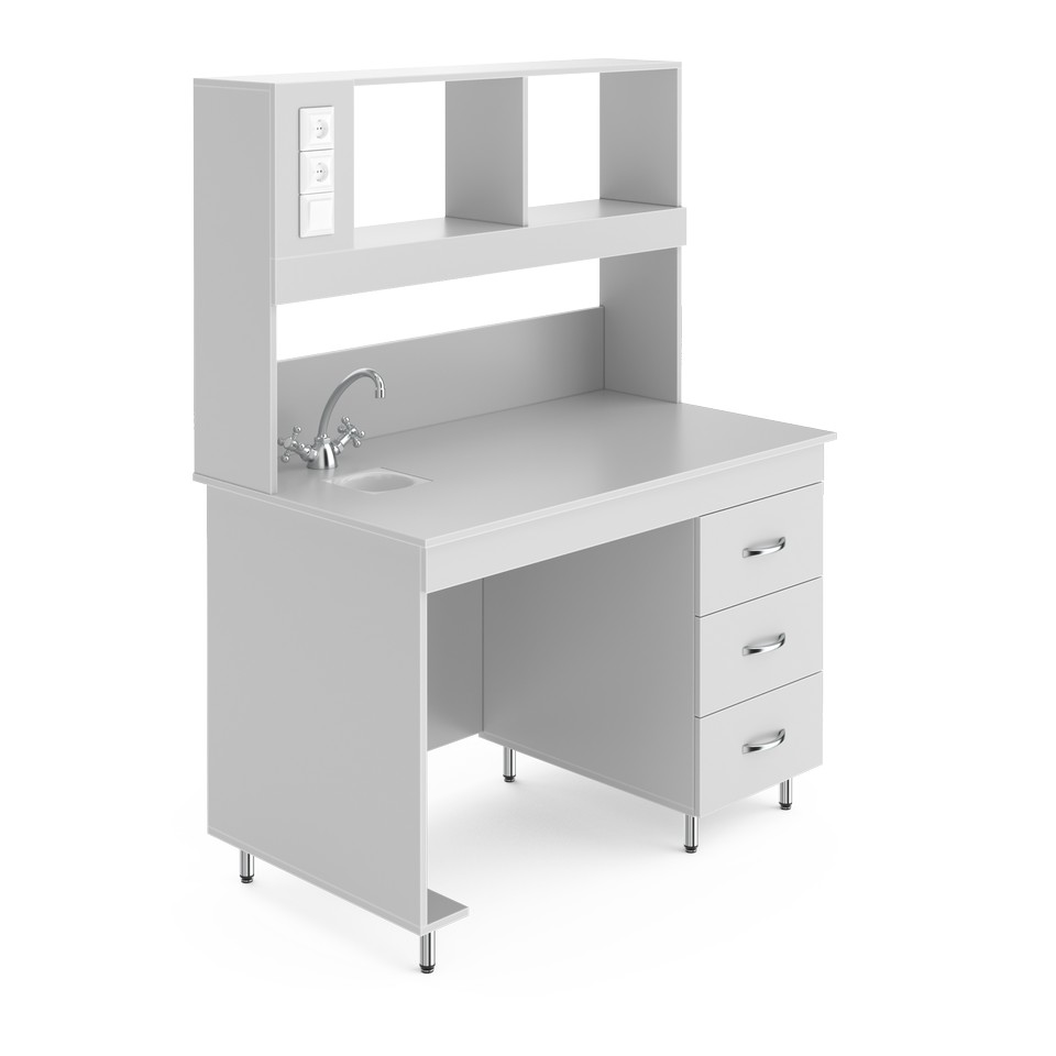 Стол для удобной работы в лабораторииСтолешница выполнена из ламинированной ДСП. Она относительно влагостойка, устойчива к кратковременному воздействию кислот, щелочей и органических растворителей. Эта столешница не переносит сильного нагрева или длительного воздействия растворителей, концентрированных кислот и щелочей. Бюджетное решение, подойдёт для школьных кабинетов химии и физики, офисной работы, размещения приборов. Это стол с сантехникой — в столешницу встроены кран и небольшая раковина-слив из полипропилена, устойчивого к агрессивным химическим веществам. Её диаметр 135 мм и глубина 110 мм. Надстройка позволяет компактно размещать нужные реактивы и лабораторную посуду рядом с рабочим местом. Её глубина 25 см, а высота 80 см. Рабочая зона освещается светодиодной лампой (входит в комплектацию). Выключатель находится слева на надстройке. Там же расположены две розетки, одна из которых с заземлением. Розетки со степенью зашиты IP20, максимальная нагрузка: 1,5 кВт. Справа под столешницей располагается встроенная тумба с тремя выдвижными ящиками. В них можно хранить лабораторную посуду, аксессуары к оборудованию или другие мелочи. Боковые ламинированные панели стола (ЛДСП толщиной 16 мм) окантованы ПВХ-кромкой толщиной 2 мм, что увеличивает их ударостойкость и механическую прочность. Ножки стола регулируются по высоте в пределах двух сантиметров, позволяя расположить его даже на достаточном неровном полу.