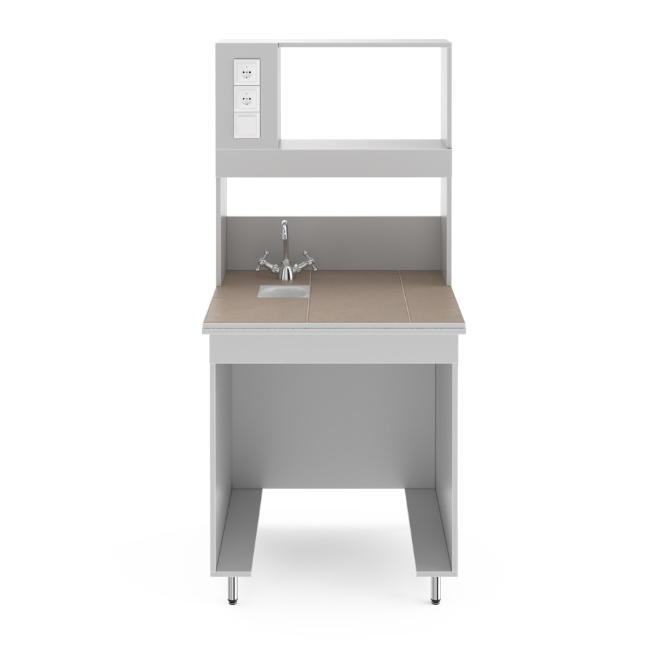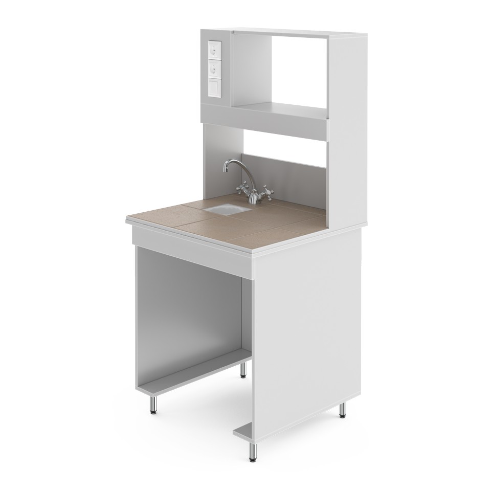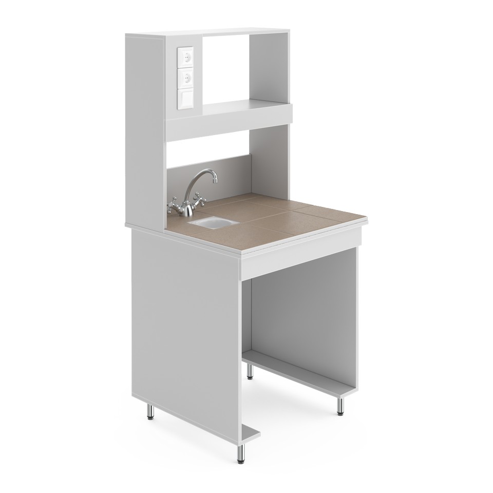 Стол для удобной работы в лабораторииСтолешница выполнена из керамогранитной плитки. Плитка влагостойка и отлично выдерживает высокие температуры. Можно ставить сушильные шкафы, бани и другие нагревательные приборы. Устойчива к продолжительному воздействию концентрированных кислот, щелочей и органических растворителей. Ограниченно стойка к плавиковой кислоте. Это один из самых популярных видов материалов столешниц для лабораторной мебели, и такой стол подойдёт для большинства химических, биологических, медицинских лабораторий и практикумов. Это стол с сантехникой — в столешницу встроены кран и небольшая раковина-слив из полипропилена, устойчивого к агрессивным химическим веществам. Её диаметр 135 мм и глубина 110 мм. Надстройка позволяет компактно размещать нужные реактивы и лабораторную посуду рядом с рабочим местом. Её глубина 25 см, а высота 80 см. Рабочая зона освещается светодиодной лампой (входит в комплектацию). Выключатель находится слева на надстройке. Там же расположены две розетки, одна из которых с заземлением. Розетки со степенью зашиты IP20, максимальная нагрузка: 1,5 кВт. Боковые ламинированные панели стола (ЛДСП толщиной 16 мм) окантованы ПВХ-кромкой толщиной 2 мм, что увеличивает их ударостойкость и механическую прочность. Ножки стола регулируются по высоте в пределах двух сантиметров, позволяя расположить его даже на достаточном неровном полу.