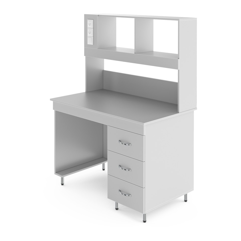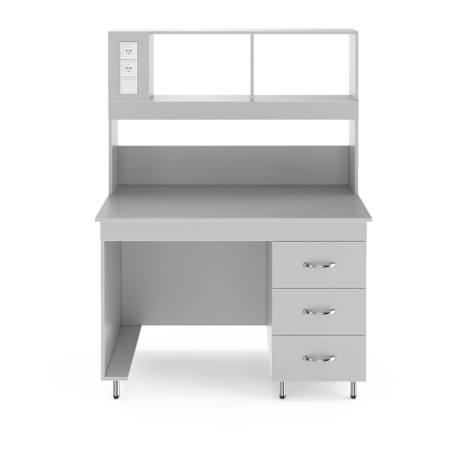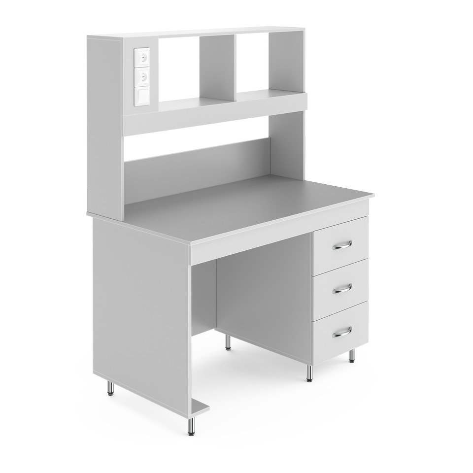 Стол для удобной работы в лабораторииСтолешница выполнена из химстойкого пластика. Он влагостоек, устойчив к длительному воздействию концентрированных кислот и щелочей. Ограниченно стоек к высокой температуре и к длительному воздействию органических растворителей. На такую столешницу не следует ставить печи или сушильные шкафы. Хороший выбор для учебных практикумов, аналитических и медицинских лабораторий. Надстройка позволяет компактно размещать нужные реактивы и лабораторную посуду рядом с рабочим местом. Её глубина 25 см, а высота 80 см. Рабочая зона освещается люминесцентной лампой (входит в комплектацию). Выключатель находится слева на надстройке. Там же расположены две розетки, одна из которых с заземлением. Розетки со степенью зашиты IP20, максимальная нагрузка: 1,5 кВт. Справа под столешницей располагается встроенная тумба с тремя выдвижными ящиками. В них можно хранить лабораторную посуду, аксессуары к оборудованию или другие мелочи. Боковые ламинированные панели стола (ЛДСП толщиной 16 мм) окантованы ПВХ-кромкой толщиной 2 мм, что увеличивает их ударостойкость и механическую прочность. Ножки стола регулируются по высоте в пределах двух сантиметров, позволяя расположить его даже на достаточном неровном полу.
