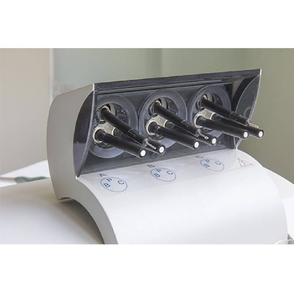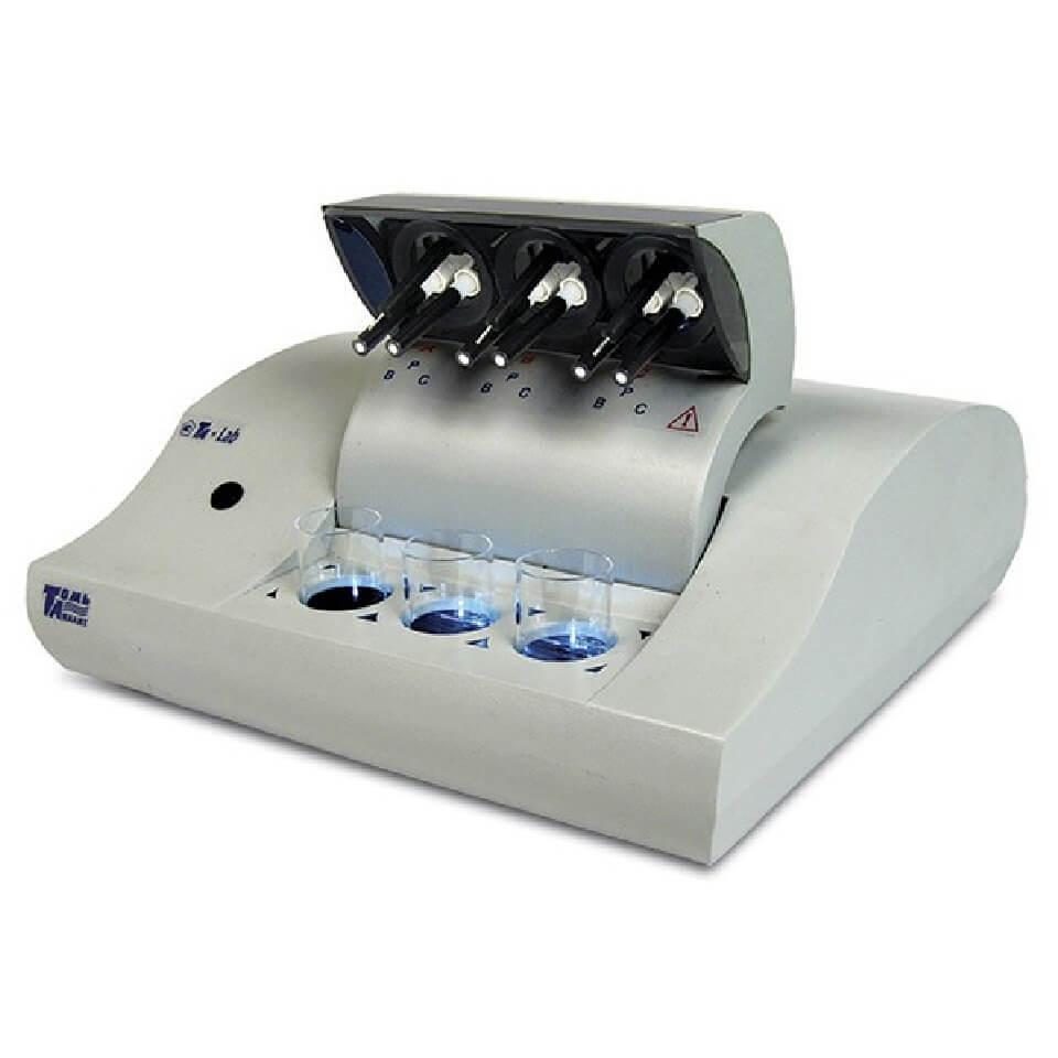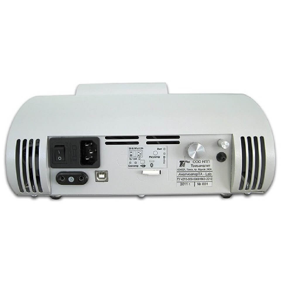 Получение одновременно трёх результатов измерений одной пробы в условиях повторяемости или анализ трёх проб одновременно значительно увеличивает производительность вольтамперометрического анализатора и позволяет использовать автоматический расчёт результата измерений по двум (трём) результатам единичного анализа, а также автоматически рассчитывать показатели повторяемости и точности результата анализа. Каждая ячейка анализатора индивидуально закрывается крышкой и дополнительно все три ячейки анализатора закрываются общей крышкой. Такая двойная защита не только увеличивает безопасность применения анализатора, но и увеличивает стабильность регистрации аналитических сигналов. Равномерное и интенсивное ультрафиолетовое облучение электрохимических ячеек сокращает время измерений, увеличивает точность результатов анализа и продлевает срок службы амальгамных электродов. Возможность барботажа анализируемых растворов озоном позволяет проводить определение ртути в водах без предварительной подготовки проб и существенно сокращает время отмывки электрохимических ячеек при определении тяжелых металлов. Металлический корпус анализатора ТА-Lab, по сравнению с широко применяемыми пластиковыми корпусами, обеспечивает высокий уровень помехозащищенности, абсолютную стойкость к УФ-излучению, устойчивость к агрессивным средам и механическим воздействиям. Базовый комплект поставки анализатора ТА-Lab:
