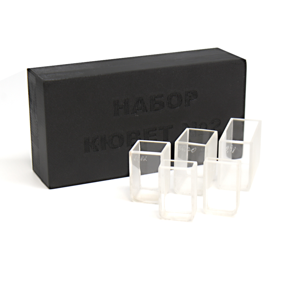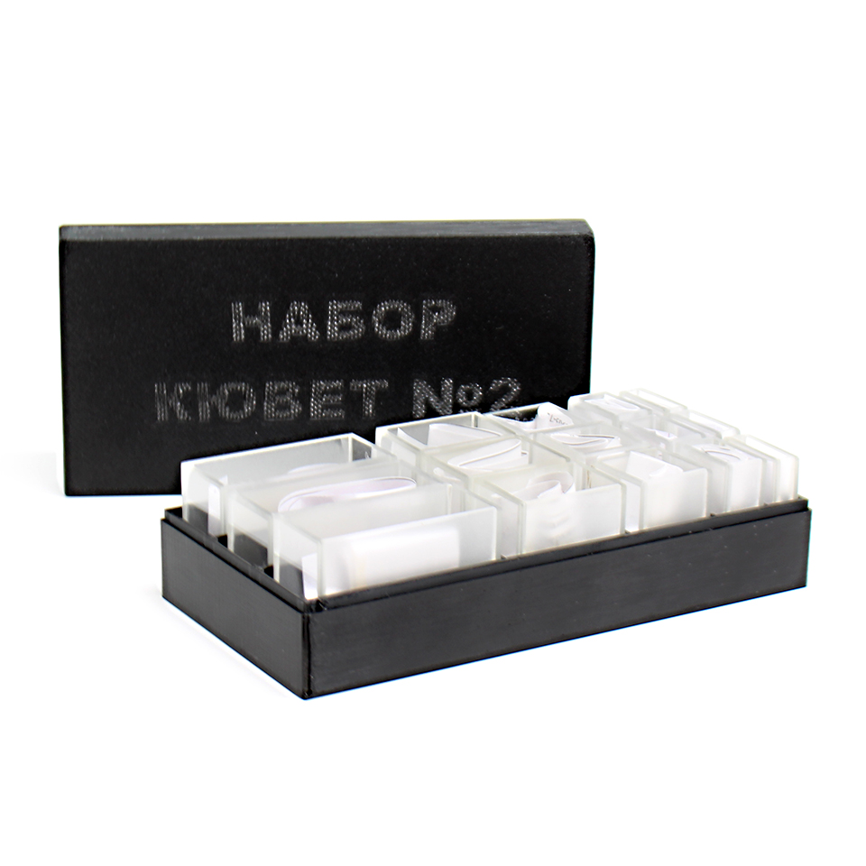 Набор кювет №2 включает кюветы с длиной оптического пути 5, 10, 20, 30, 50 мм по 3 шт. Выполнены по стандарту КФК (ширина 24 мм). Подходят для приборов КФК-2, КФК-3-01, ПЭ-5300/5400, UNICO-1201/2100 и других. Кюветы оптические предназначены для фотометрирования в фотометрах, колориметрах, флуориметрах, микроколориметрах, гемоглобинометрах и других приборах с кислотами, щелочами и органическими растворителями. Кюветы изготовлены из оптического стекла К-8. Их технологической особенностью является повышенная устойчивость к агрессивным реагентам, что позволяет многократно использовать кюветы для любых исследований. Произведены в России.