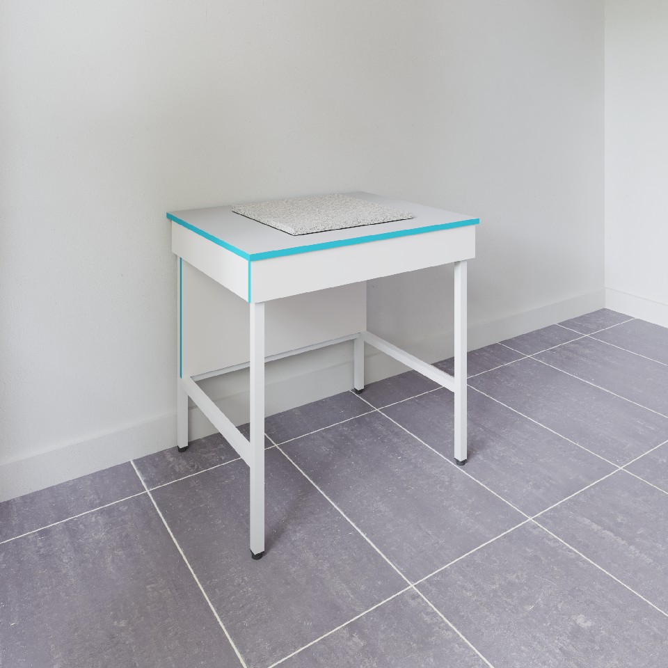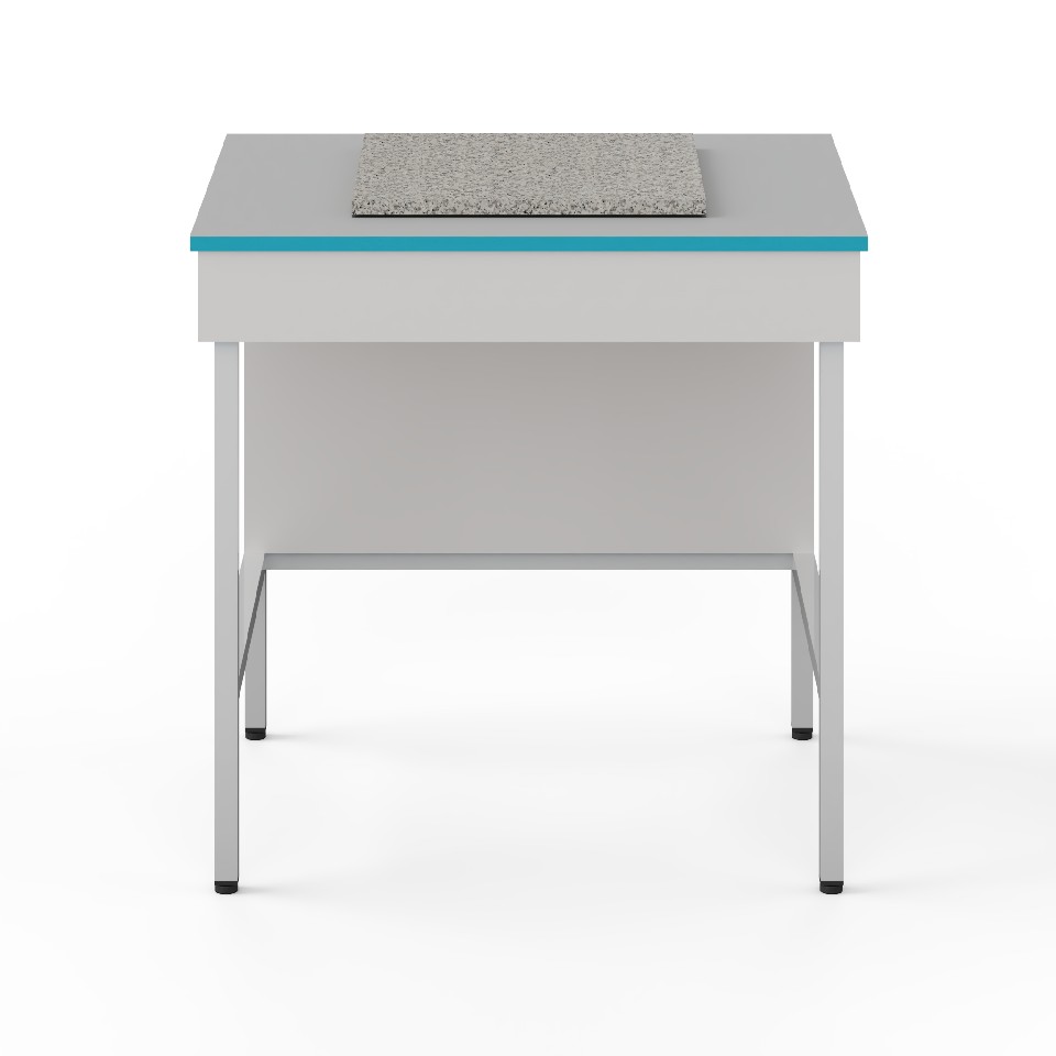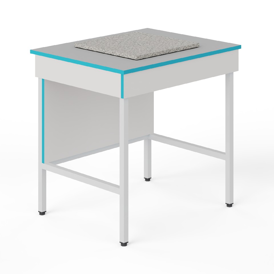 Размер антивибрационной платформы: 400×400 мм. Для максимальной изоляции от вибраций весы нужно ставить по центру этой столешницы. Основа стола: цельносварной металлический каркас, окрашенный белой порошковой краской. В конструкции не используются резиновые демпферы, которые имеют ограниченный срок эксплуатации. Большая столешница сделана из ламинированного ДСП. Он хорошо подходит для размещения приборов, но нестоек к воздействию концентрированных кислот, щелочей и органических растворителей. Демпфирующая платформа сделана из монолитной гранитной плиты. Она выступает над основной столешницей. Нижняя столешница и боковые ламинированные панели (ЛДСП толщиной 16 мм) окантованы прочной ПВХ-кромкой толщиной 2 мм, что увеличивает их ударостойкость и механическую прочность. Ножки стола регулируются по высоте в пределах двух сантиметров, позволяя расположить его даже на достаточном неровном полу.