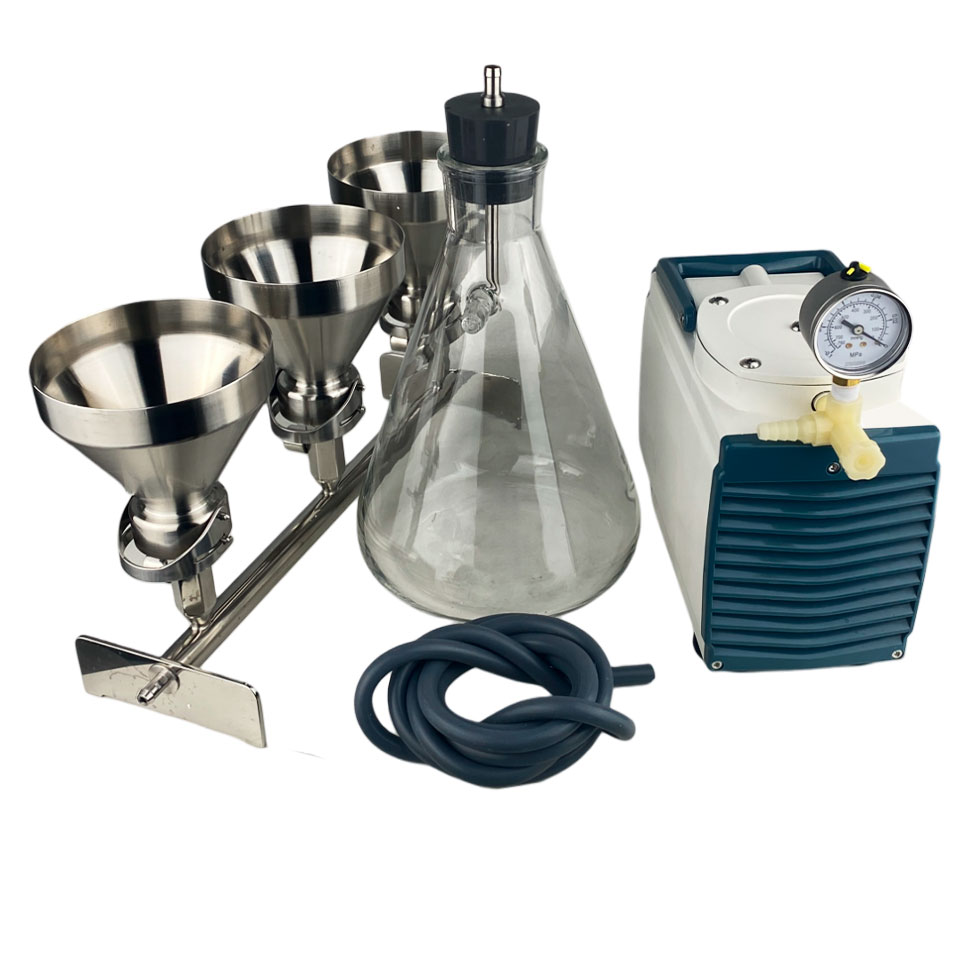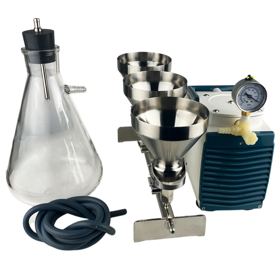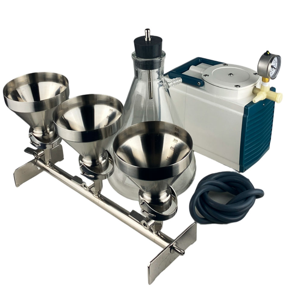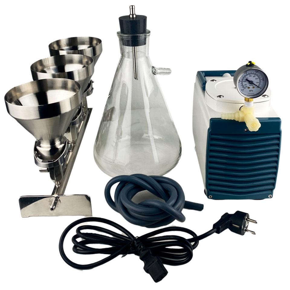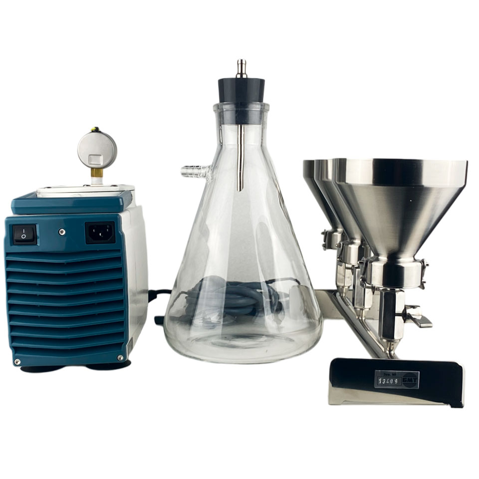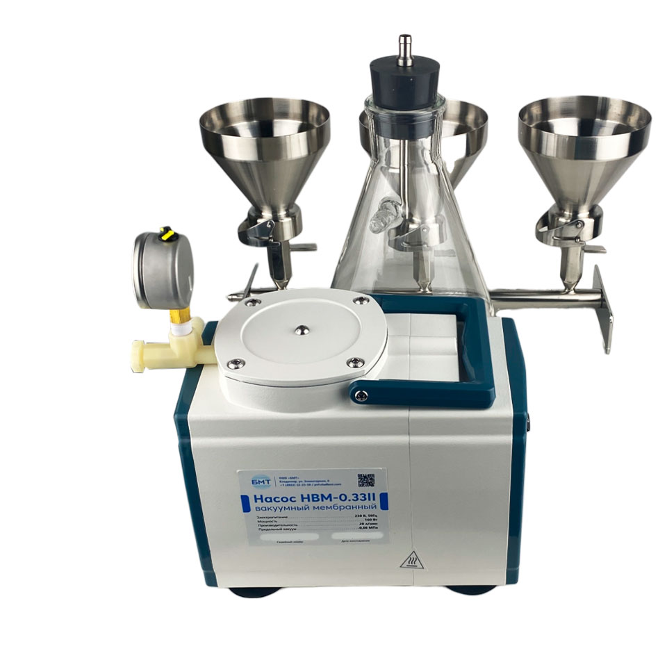 Фильтровальная ячейка предназначена для фильтрования под вакуумом. Состоит из коллектора с основаниями, на верхнем торце которых находятся титановые фритты для размещения дисковых фильтров. Воронки крепятся к основаниям при помощи зажимов. Краны на коллекторе позволяют отключать и подключать к источнику вакуума каждую воронку. Воронки отполированы и не имеют швов. На внутренней стороне воронок нанесены риски для контроля залитого объёма по 100 мл. Крышки из нержавеющей стали поставляются по запросу. Компактный вакуумный насос мембранного типа НВМ-0,33II используется для систем лабораторного фильтрования. Снабжён вакуумметром с гидрозаполненной шкалой, вентилем для регулировки и сброса вакуума. Имеет транспортировочную ручку и присоски для плотного фиксирования на лабораторном столе. Ресивер (колба Бунзена) предназначен для фильтрования под вакуумом и сбора фильтрата в приборах с вакуумным насосом. Изготавливается из термически стойкого стекла. В колбу устанавливается пробка с отверстием для штуцера на подключении фильтра-влагоотделителя и вакуумного насоса. Фильтр-влагоотделитель ФВГ-022 устанавливается между ресивером и вакуумным насосом с целью предотвращения попадания капельной жидкости из колбы в камеру насоса. Фильтр высушивается и стерилизуется автоклавированием.