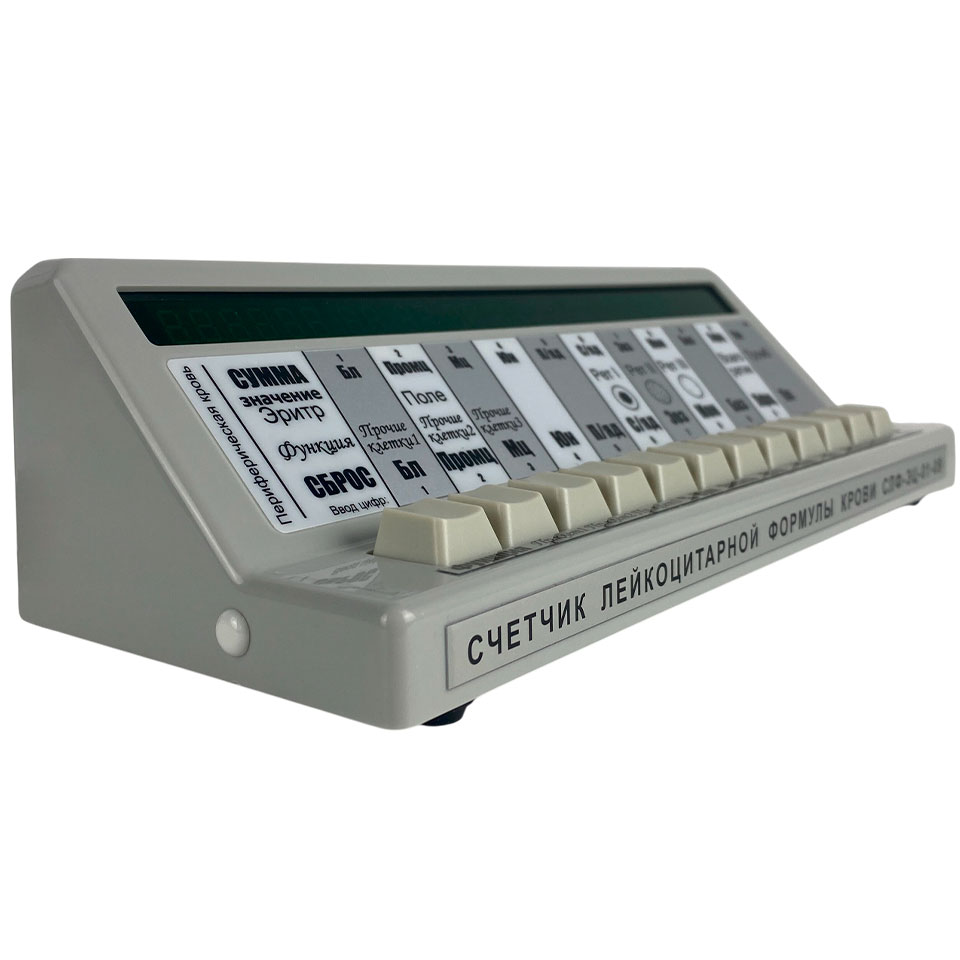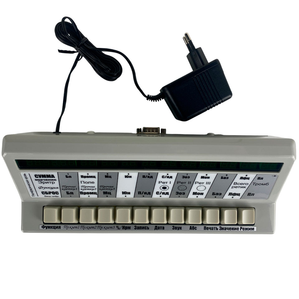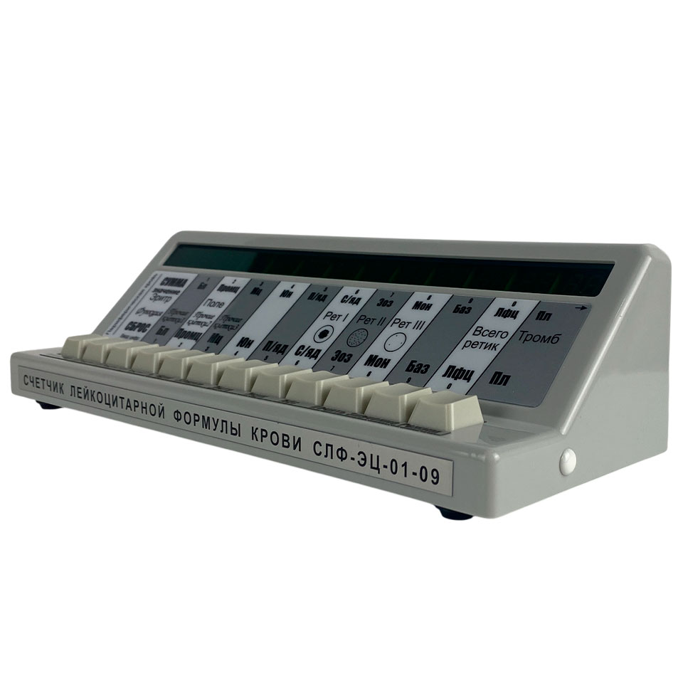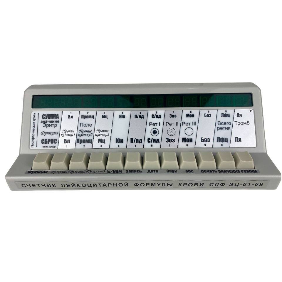 ОписаниеСчётчик лейкоцитарной формулы крови Медтехника СЛФ-ЭЦ-01-09 Счётчик лейкоцитарной формулы крови СЛФ-ЭЦ-01-09 предназначен для подсчёта количества клеток и определения лейкоцитарной формулы крови при микроскопическом анализе. С помощью счётчика можно также производить счёт ретикулоцитов (на 1000 эритроцитов) в окрашенных мазках и тромбоцитов по Фонио. Прибор обеспечивает подсчёт по девяти каналам форменных элементов крови: миелоциты, метамиелоциты (юные), палочкоядерные, сегментоядерные, эозинофилы, базофилы, моноциты, лимфоциты, патологические элементы, а также накопление суммарного результата по всем девяти каналам. Подсчёт производится нажатием клавиш, каждая из которых имеет обозначение клетки, соответствующей визуально наблюдаемой под микроскопом. Значение, равное количеству сосчитанных клеток, выводится на дисплей счётчика. При нажатии на любую клавишу раздаётся короткий звуковой сигнал. При достижении суммарного числа клеток равного или кратного 100 раздаётся длинный звуковой сигнал (около 2 с), на время действия которого счёт по всем каналам блокируется. При блокировке от случайного нажатия двух клавиш одновременно раздаётся звуковой сигнал низкого тона. С помощью клавиши «%» можно отобразить на экране показания каждого из каналов в процентном соотношении по отношению к общему количеству подсчитанных клеток. Преимущества СЛФ-ЭЦ-01-09