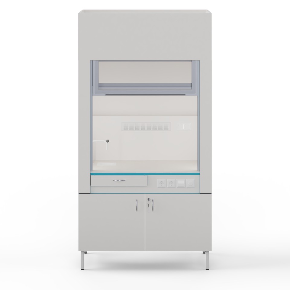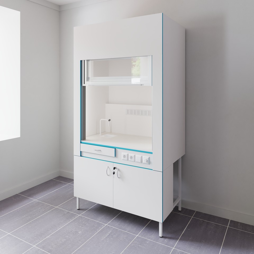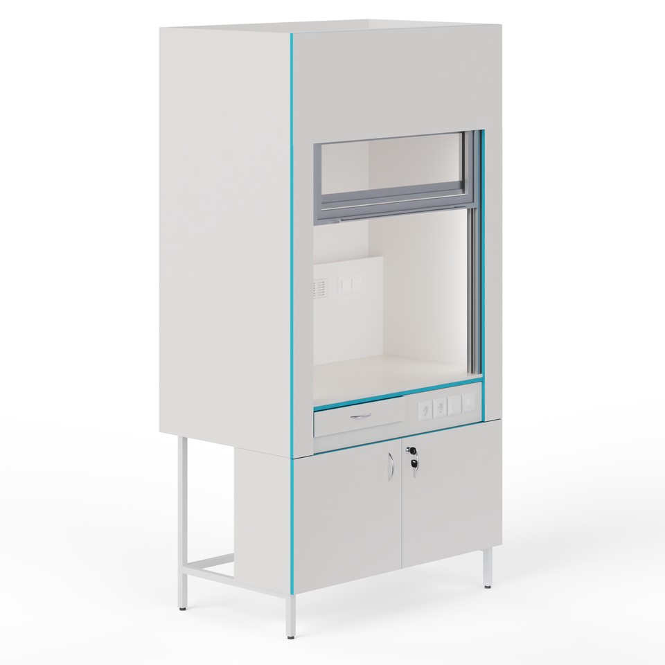 У тумбы есть своя вытяжка (диаметр патрубка 100 мм), которая позволяет хранить реактивы внутри тумбы. Помимо этого, дверцы тумбы оборудованы специальными доводчиками, которые позволяют бесшумно и аккуратно её закрывать. Влагозащищённые розетки внутри шкафа