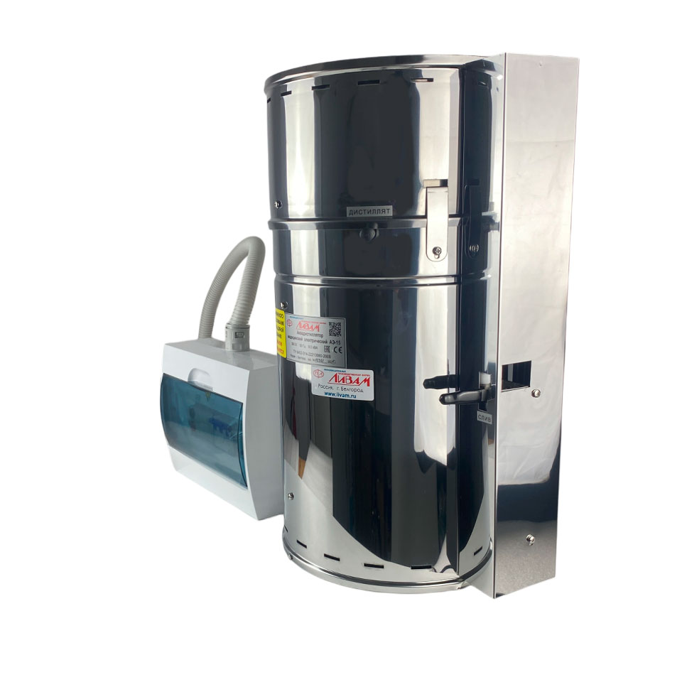 Дистиллятор оснащён специальным теплозащитным кожухом, обеспечивающим оптимальную умеренно тёплую температуру поверхности аквадистиллятора (не более 45 °С) при его работе и предохраняющий персонал от тепловых ожогов.