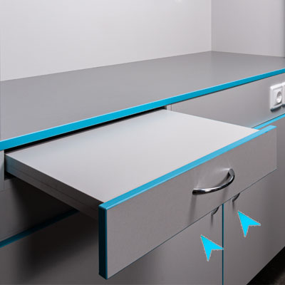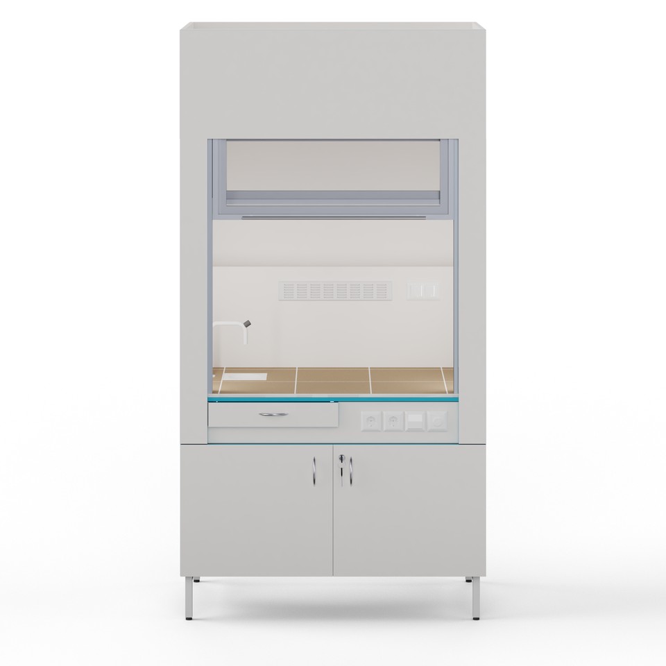 У тумбы есть своя вытяжка (диаметр патрубка 100 мм), которая позволяет хранить реактивы внутри тумбы. Помимо этого, дверцы тумбы оборудованы специальными доводчиками, которые позволяют бесшумно и аккуратно её закрывать. Влагозащищённые розетки внутри шкафа