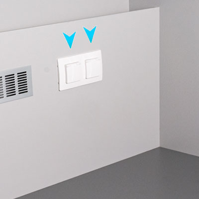 По бокам защитного экрана внутри рабочей камеры есть две светодиодные лампы для дополнительного освещения. Их яркость можно регулировать. Полочка внутри шкафа