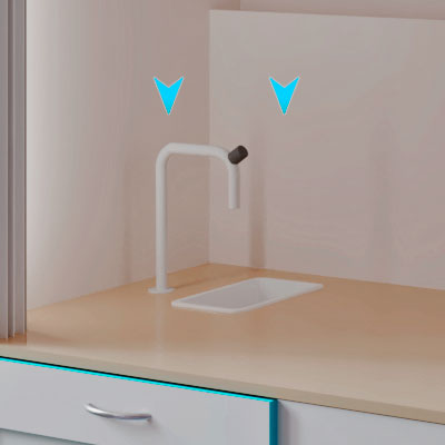 Защитный экран шкафа можно легко поднять одной рукой. Он складывается и при поднятии не увеличивает общую высоту шкафа. Дополнительная подсветка