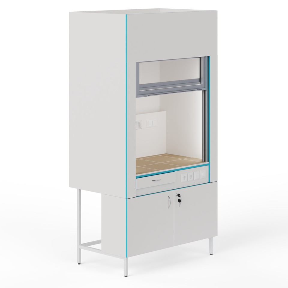 Рабочая зона шкафа стоит на прочном цельносварном металлическом каркасе, покрытом порошковой краской. Внутрь шкафа можно ставить тяжёлое оборудование. Вытяжка из нижней тумбы