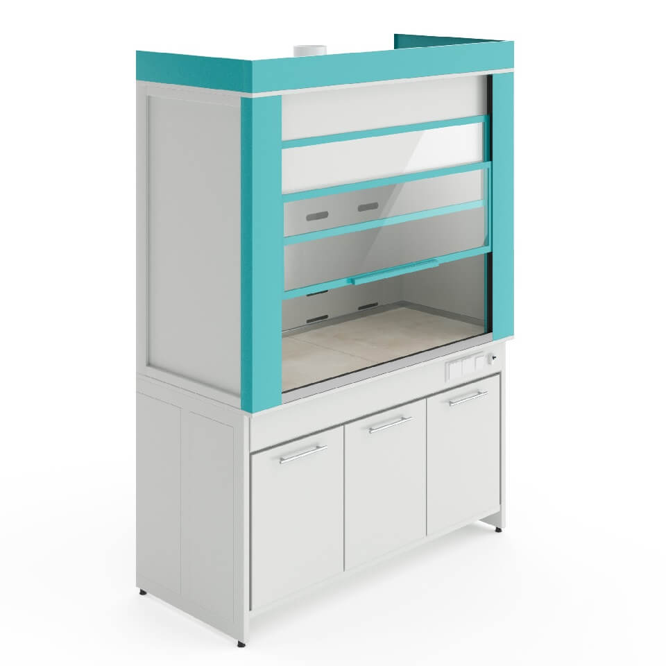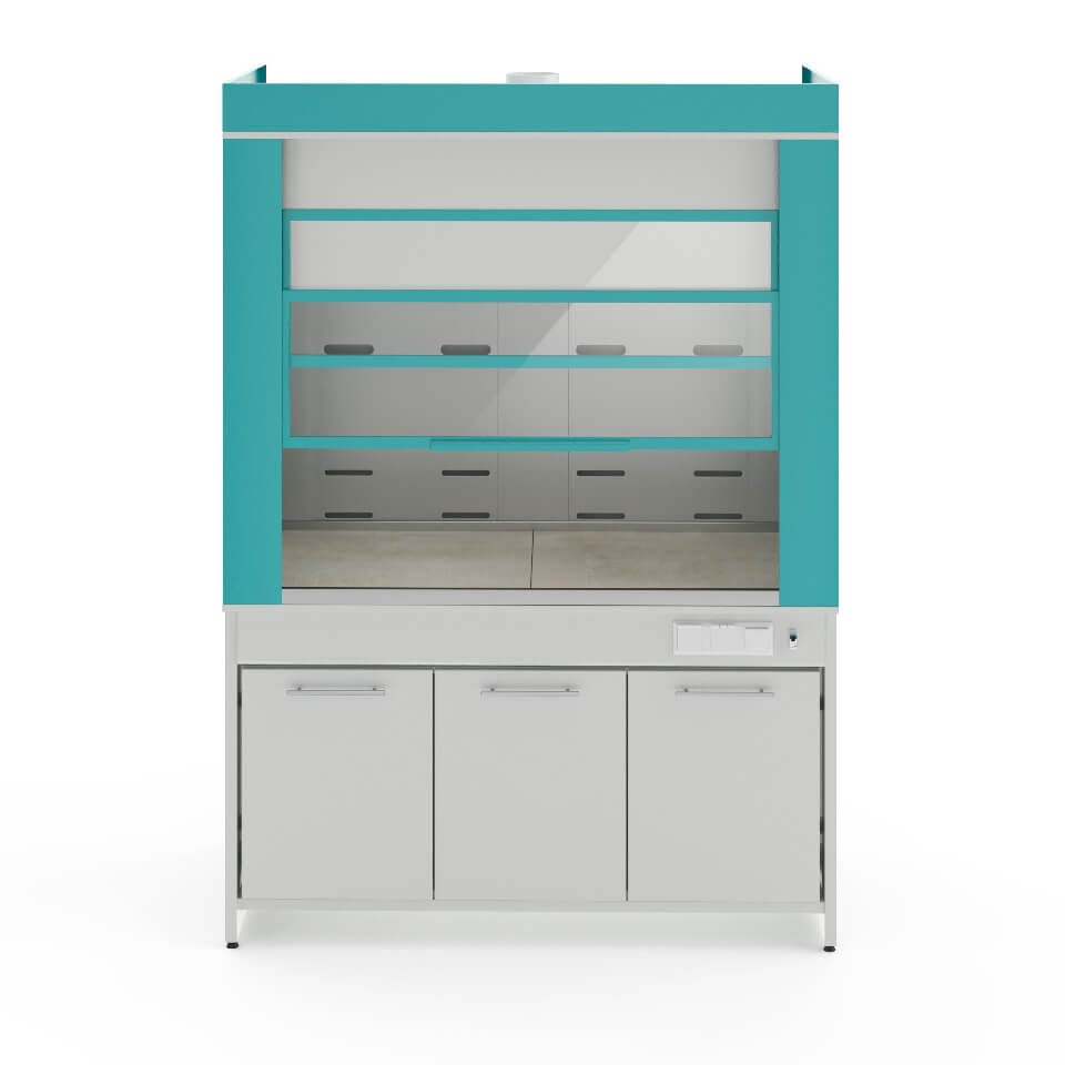 Надёжный и прочный шкаф для лабораторииСтолешница выполнена из монолитной керамики (размеры плиты: 120×60 см, в столешнице есть один шов). Она отлично подходит для всех химических лабораторий, в том числе для тех, которые работают с веществами при высоких температурах. Превосходно переносит нагрев, влагостойка, устойчива к воздействию кислот и щелочей. На столешнице можно размещать высокотемпературное оборудование (сушильные шкафы, муфельные печи). Шкаф смонтирован на цельносварном металлическом каркасе, покрытом прочной порошковой краской. Все панели выполнены из металла с полимерным покрытием. Передний противопроливочный бортик сделан из шлифованной нержавеющей стали AISI-316. В рабочей камере есть четыре зоны вытяжки: они расположены в куполе вытяжного бокса и выше уровня столешницы. Диаметр фланца для подключения к системе вентиляции: 200 мм. Зона вытяжки также сделана из металла. Защитный экран шкафа можно легко поднять одной рукой. Он складывается и при поднятии не увеличивает общую высоту шкафа. Сделан из закалённого стекла толщиной 4 мм в алюминиевой раме. Розетки и выключатель светодиодной лампы расположены вне рабочей зоны, справа на передней панели шкафа. Розетки брызгозащищённые и рассчитаны на ток до 16 А и напряжение до 250 В. Рядом с выключателем расположен тумблер автомата аварийного отключения питания. Нужные для работы реактивы можно разместить в нижней тумбе шкафа. Тумба тоже сделана из металла. У тумбы есть распашные двери и одна несъёмная полка. У неё есть своя вытяжка (диаметр патрубка 100 мм), которую с помощью патрубка, входящего в комплект шкафа, можно подключить к общей вытяжной системе шкафа. Ножки шкафа регулируются по высоте, позволяя расположить шкаф даже на достаточном неровном полу.