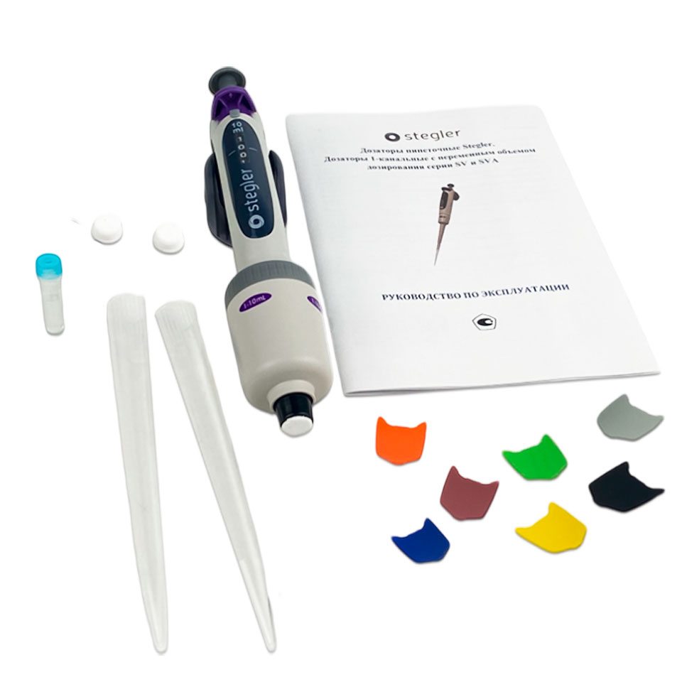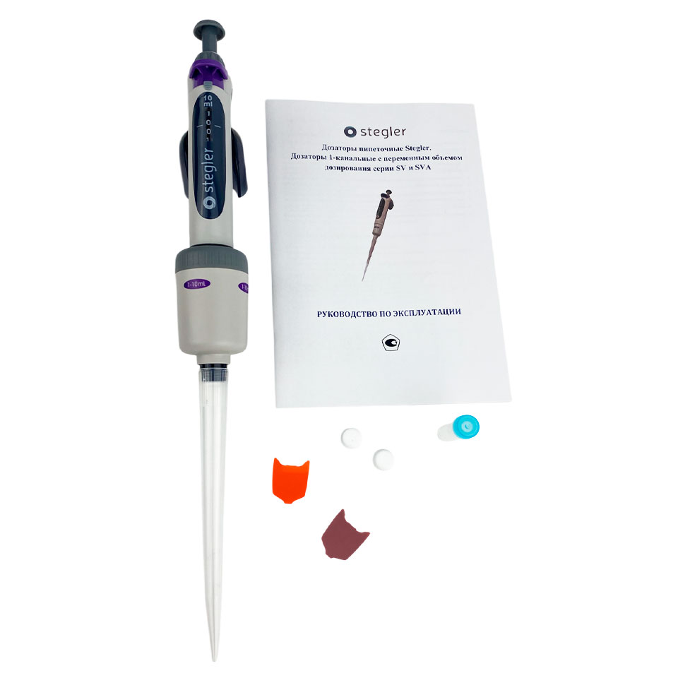 Одноканальный дозатор переменного объёма Stegler SVA-1-10-100 (10-100 мкл, полностью автоклавируемый)